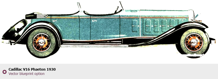 Raster blueprint of the 1930 Cadillac V16 Phaeton Phaeton. This free downloadable image can be used for graphic projects, digital design, and 3D modeling. The file provides accurate exterior proportions of the vehicle. Model year: 1930. Body type: Phaeton.
