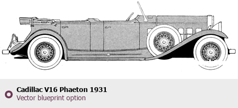Raster blueprint of the 1931 Cadillac V16 Phaeton Phaeton. This free downloadable image can be used for graphic projects, digital design, and 3D modeling. The file provides accurate exterior proportions of the vehicle. Model year: 1931. Body type: Phaeton.
