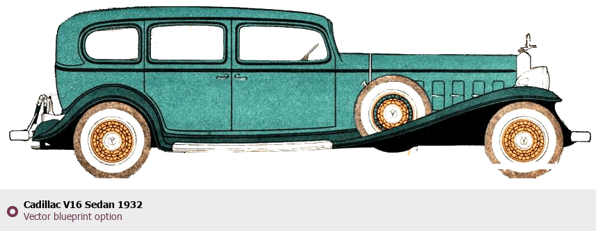Raster blueprint of the 1932 Cadillac V16 Sedan Sedan. This free downloadable image can be used for graphic projects, digital design, and 3D modeling. The file provides accurate exterior proportions of the vehicle. Model year: 1932. Body type: Sedan.