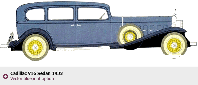 Raster blueprint of the 1932 Cadillac V16 Sedan Sedan. This free downloadable image can be used for graphic projects, digital design, and 3D modeling. The file provides accurate exterior proportions of the vehicle. Model year: 1932. Body type: Sedan.