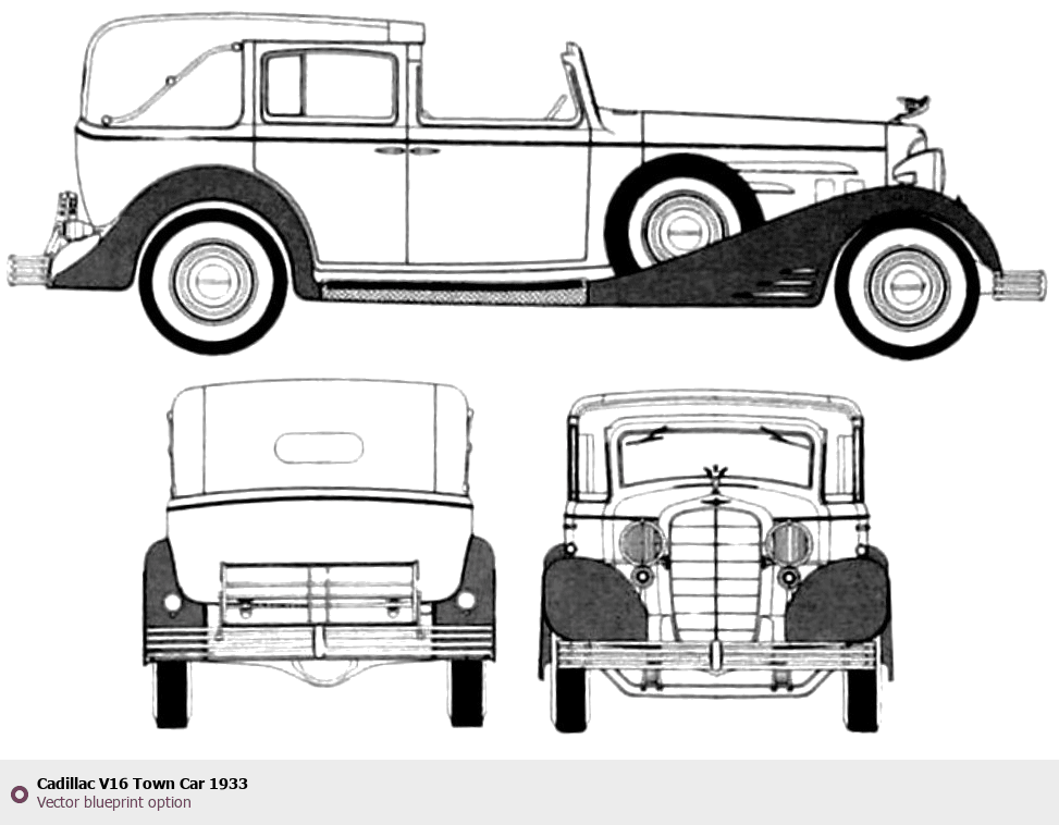 Raster blueprint of the 1933 Cadillac V16 Town Car Tag. This free downloadable image can be used for graphic projects, digital design, and 3D modeling. The file provides accurate exterior proportions of the vehicle. Model year: 1933. Body type: Tag.