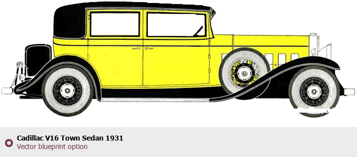 Raster blueprint of the 1931 Cadillac V16 Town Sedan Sedan. This free downloadable image can be used for graphic projects, digital design, and 3D modeling. The file provides accurate exterior proportions of the vehicle. Model year: 1931. Body type: Sedan.
