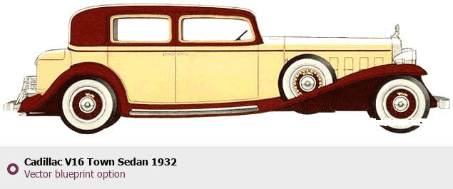 Raster blueprint of the 1932 Cadillac V16 Town Sedan Sedan. This free downloadable image can be used for graphic projects, digital design, and 3D modeling. The file provides accurate exterior proportions of the vehicle. Model year: 1932. Body type: Sedan.