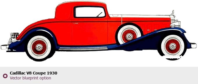 Raster blueprint of the 1930 Cadillac V8 Coupe Coupe. This free downloadable image can be used for graphic projects, digital design, and 3D modeling. The file provides accurate exterior proportions of the vehicle. Model year: 1930. Body type: Coupe.