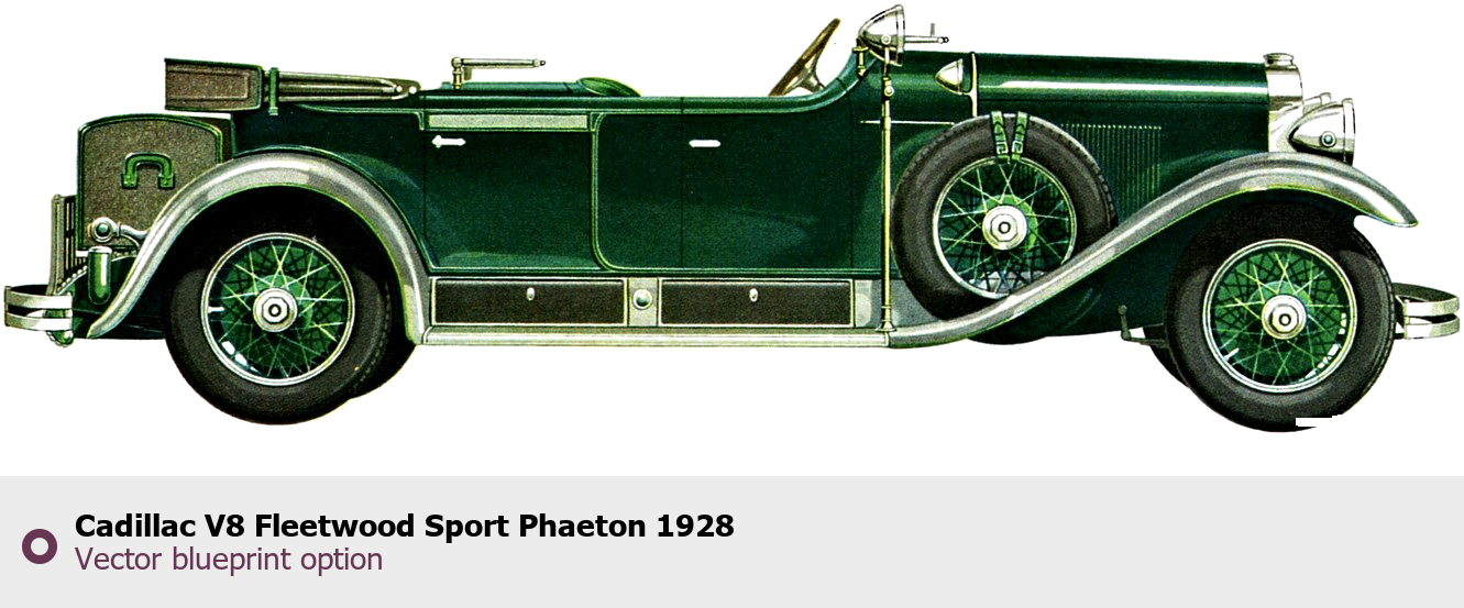 Raster blueprint of the 1928 Cadillac V8 Fleetwood Sport Phaeton Phaeton. This free downloadable image can be used for graphic projects, digital design, and 3D modeling. The file provides accurate exterior proportions of the vehicle. Model year: 1928. Body type: Phaeton.