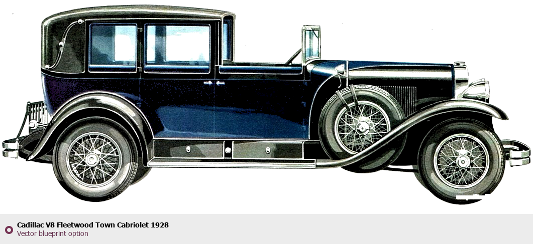 Raster blueprint of the 1928 Cadillac V8 Fleetwood Town Cabriolet Cabriolet. This free downloadable image can be used for graphic projects, digital design, and 3D modeling. The file provides accurate exterior proportions of the vehicle. Model year: 1928. Body type: Cabriolet.