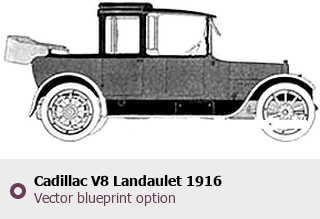 Raster blueprint of the 1916 Cadillac V8 Landaulet Tag. This free downloadable image can be used for graphic projects, digital design, and 3D modeling. The file provides accurate exterior proportions of the vehicle. Model year: 1916. Body type: Tag.