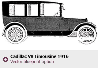Raster blueprint of the 1916 Cadillac V8 Limousine Limousine. This free downloadable image can be used for graphic projects, digital design, and 3D modeling. The file provides accurate exterior proportions of the vehicle. Model year: 1916. Body type: Limousine.