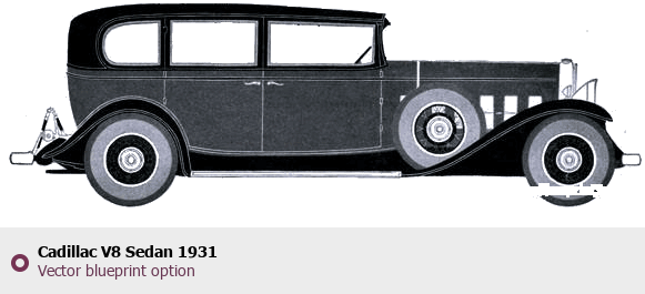 Raster blueprint of the 1931 Cadillac V8 Sedan Sedan. This free downloadable image can be used for graphic projects, digital design, and 3D modeling. The file provides accurate exterior proportions of the vehicle. Model year: 1931. Body type: Sedan.