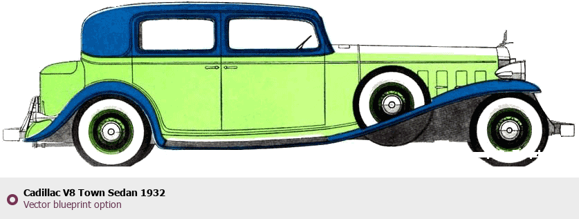 Raster blueprint of the 1932 Cadillac V8 Town Sedan Sedan. This free downloadable image can be used for graphic projects, digital design, and 3D modeling. The file provides accurate exterior proportions of the vehicle. Model year: 1932. Body type: Sedan.