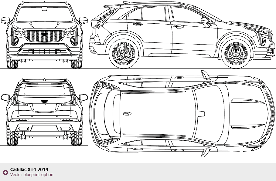 Raster blueprint of the 2019 Cadillac XT4 Tag. This free downloadable image can be used for graphic projects, digital design, and 3D modeling. The file provides accurate exterior proportions of the vehicle. Model year: 2019. Body type: Tag.
