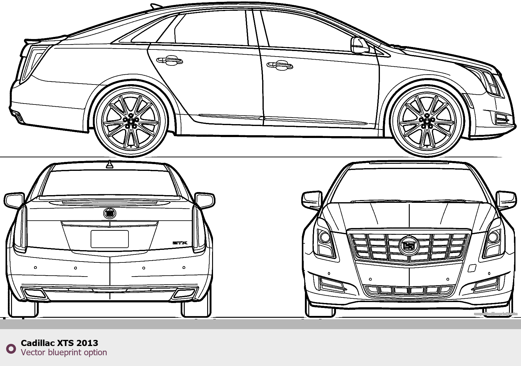 Raster blueprint of the 2013 Cadillac XTS Sedan. This free downloadable image can be used for graphic projects, digital design, and 3D modeling. The file provides accurate exterior proportions of the vehicle. Model year: 2013. Body type: Sedan.