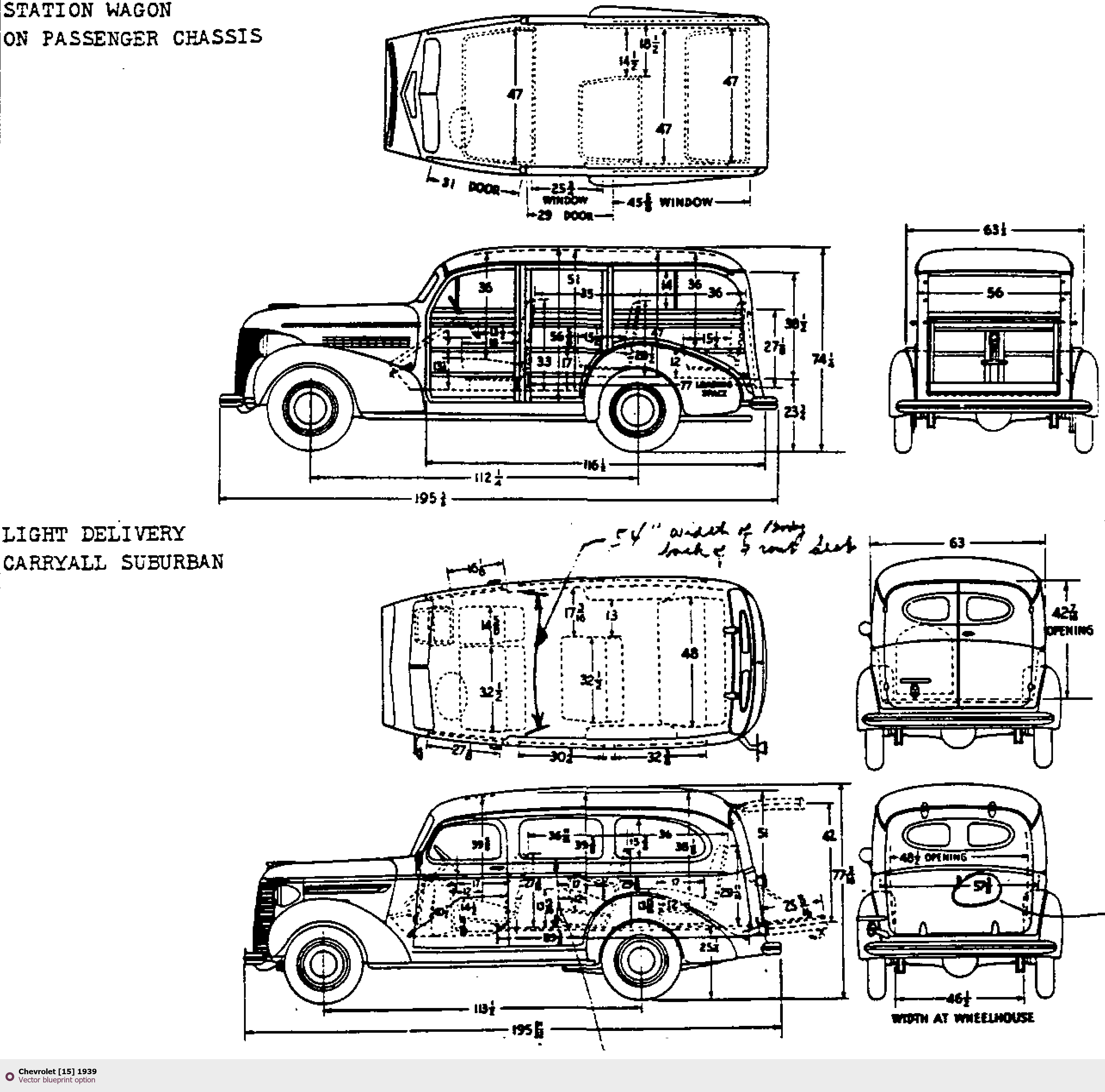 Raster blueprint of the 1939 Chevrolet [15] Tag. This free downloadable image can be used for graphic projects, digital design, and 3D modeling. The file provides accurate exterior proportions of the vehicle. Model year: 1939. Body type: Tag.