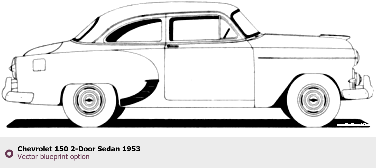 Raster blueprint of the 1953 Chevrolet 150 2-Door Sedan Sedan. This free downloadable image can be used for graphic projects, digital design, and 3D modeling. The file provides accurate exterior proportions of the vehicle. Model year: 1953. Body type: Sedan.