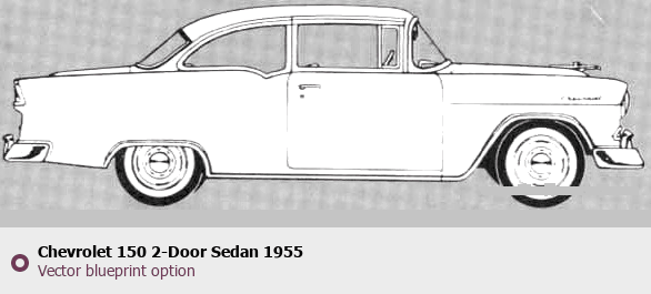 Raster blueprint of the 1955 Chevrolet 150 2-Door Sedan Sedan. This free downloadable image can be used for graphic projects, digital design, and 3D modeling. The file provides accurate exterior proportions of the vehicle. Model year: 1955. Body type: Sedan.