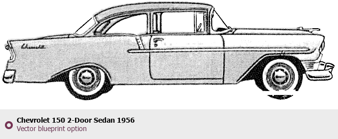 Raster blueprint of the 1956 Chevrolet 150 2-Door Sedan Sedan. This free downloadable image can be used for graphic projects, digital design, and 3D modeling. The file provides accurate exterior proportions of the vehicle. Model year: 1956. Body type: Sedan.