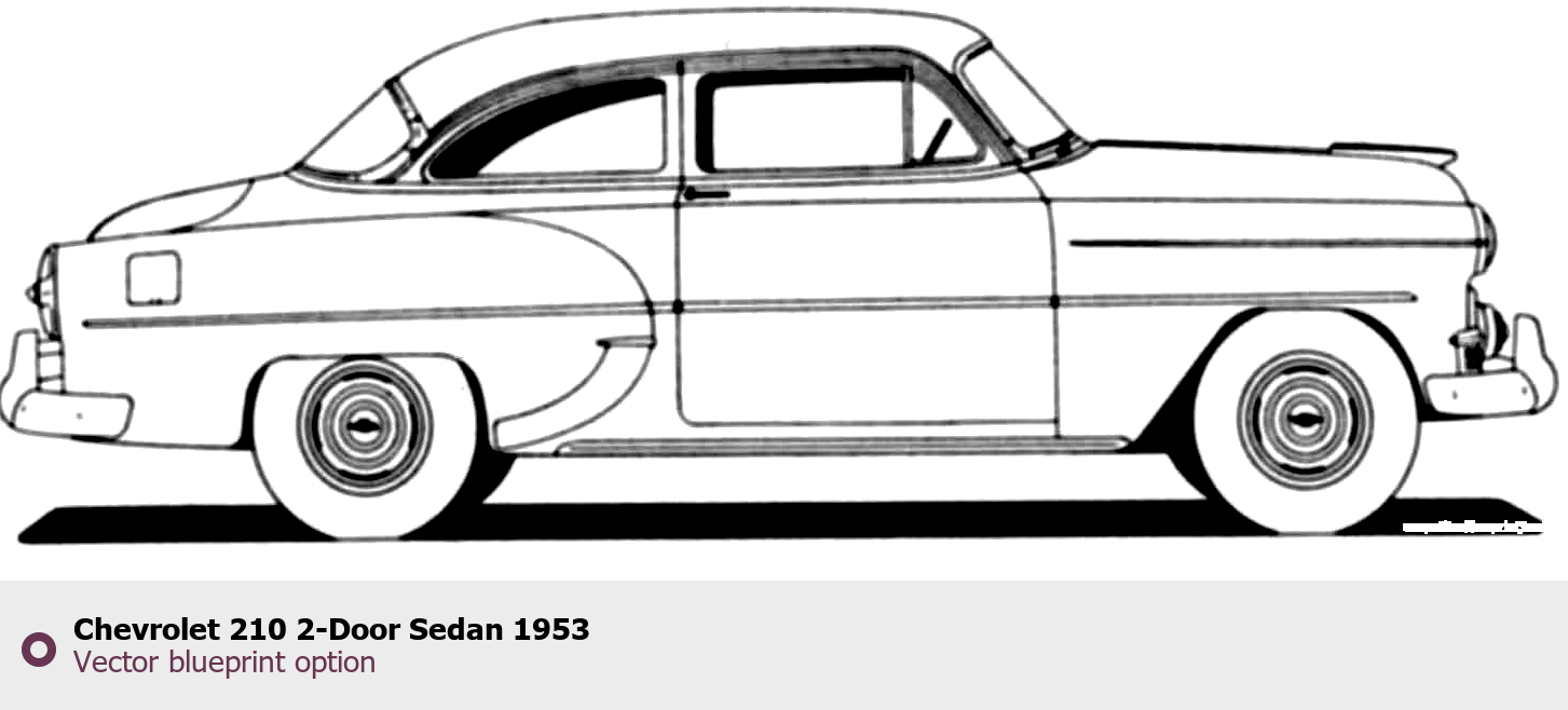 Raster blueprint of the 1953 Chevrolet 210 2-Door Sedan Sedan. This free downloadable image can be used for graphic projects, digital design, and 3D modeling. The file provides accurate exterior proportions of the vehicle. Model year: 1953. Body type: Sedan.