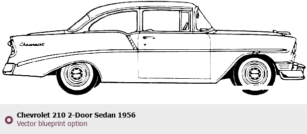 Raster blueprint of the 1956 Chevrolet 210 2-Door Sedan Sedan. This free downloadable image can be used for graphic projects, digital design, and 3D modeling. The file provides accurate exterior proportions of the vehicle. Model year: 1956. Body type: Sedan.