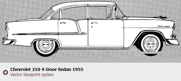 Raster blueprint of the 1955 Chevrolet 210 4-Door Sedan Sedan. This free downloadable image can be used for graphic projects, digital design, and 3D modeling. The file provides accurate exterior proportions of the vehicle. Model year: 1955. Body type: Sedan.