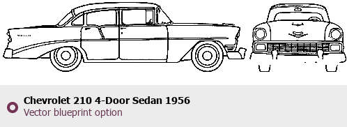 Raster blueprint of the 1956 Chevrolet 210 4-Door Sedan Sedan. This free downloadable image can be used for graphic projects, digital design, and 3D modeling. The file provides accurate exterior proportions of the vehicle. Model year: 1956. Body type: Sedan.