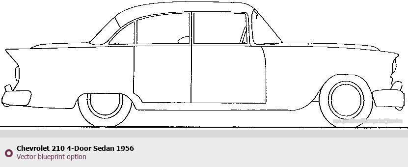 Raster blueprint of the 1956 Chevrolet 210 4-Door Sedan Sedan. This free downloadable image can be used for graphic projects, digital design, and 3D modeling. The file provides accurate exterior proportions of the vehicle. Model year: 1956. Body type: Sedan.