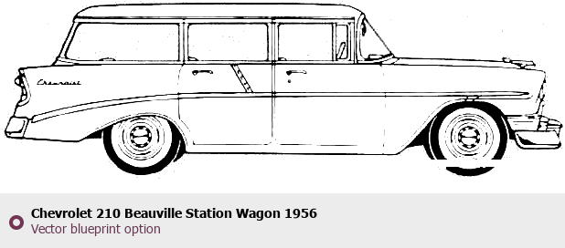 Raster blueprint of the 1956 Chevrolet 210 Beauville Station Wagon Sedan. This free downloadable image can be used for graphic projects, digital design, and 3D modeling. The file provides accurate exterior proportions of the vehicle. Model year: 1956. Body type: Sedan.
