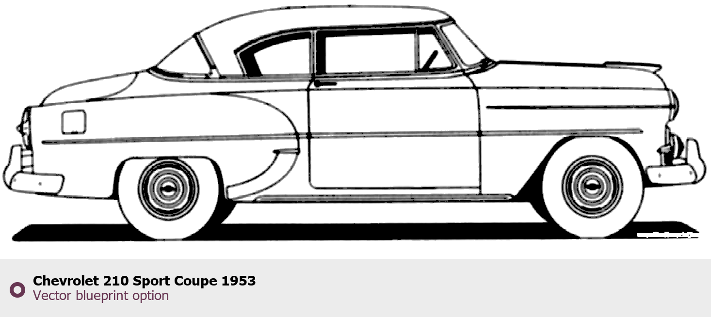 Raster blueprint of the 1953 Chevrolet 210 Sport Coupe Sedan. This free downloadable image can be used for graphic projects, digital design, and 3D modeling. The file provides accurate exterior proportions of the vehicle. Model year: 1953. Body type: Sedan.
