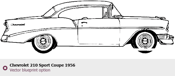 Raster blueprint of the 1956 Chevrolet 210 Sport Coupe Sedan. This free downloadable image can be used for graphic projects, digital design, and 3D modeling. The file provides accurate exterior proportions of the vehicle. Model year: 1956. Body type: Sedan.
