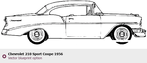 Raster blueprint of the 1956 Chevrolet 210 Sport Coupe Sedan. This free downloadable image can be used for graphic projects, digital design, and 3D modeling. The file provides accurate exterior proportions of the vehicle. Model year: 1956. Body type: Sedan.