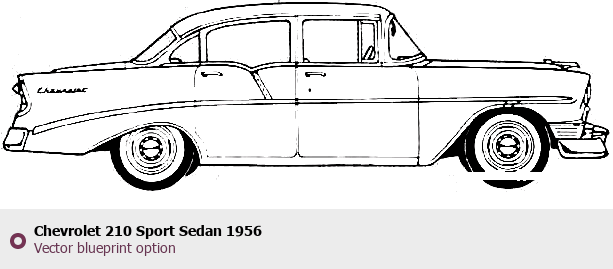 Raster blueprint of the 1956 Chevrolet 210 Sport Sedan Sedan. This free downloadable image can be used for graphic projects, digital design, and 3D modeling. The file provides accurate exterior proportions of the vehicle. Model year: 1956. Body type: Sedan.
