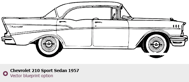 Raster blueprint of the 1957 Chevrolet 210 Sport Sedan Sedan. This free downloadable image can be used for graphic projects, digital design, and 3D modeling. The file provides accurate exterior proportions of the vehicle. Model year: 1957. Body type: Sedan.