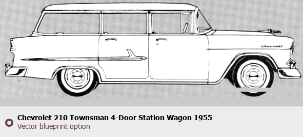 Raster blueprint of the 1955 Chevrolet 210 Townsman 4-Door Station Wagon Sedan. This free downloadable image can be used for graphic projects, digital design, and 3D modeling. The file provides accurate exterior proportions of the vehicle. Model year: 1955. Body type: Sedan.