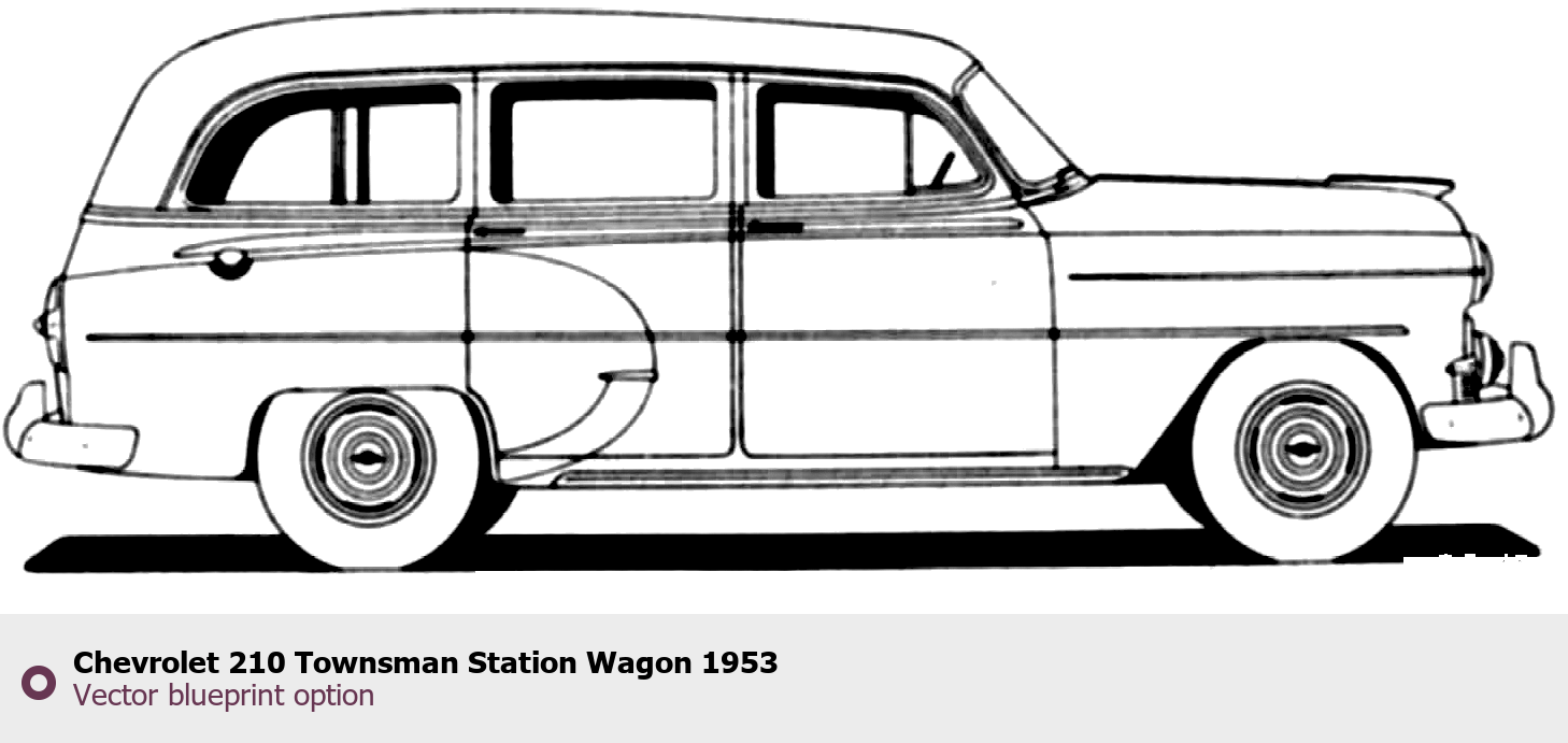 Raster blueprint of the 1953 Chevrolet 210 Townsman Station Wagon Sedan. This free downloadable image can be used for graphic projects, digital design, and 3D modeling. The file provides accurate exterior proportions of the vehicle. Model year: 1953. Body type: Sedan.