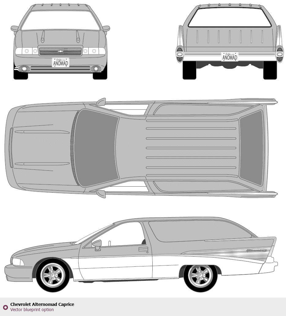 Raster blueprint of the Chevrolet Alternomad Caprice Tag. This free downloadable image can be used for graphic projects, digital design, and 3D modeling. The file provides accurate exterior proportions of the vehicle. Body type: Tag.