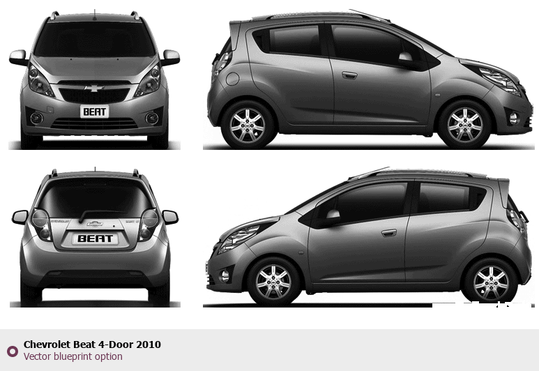 Raster blueprint of the 2010 Chevrolet Beat 4-Door Hatchback. This free downloadable image can be used for graphic projects, digital design, and 3D modeling. The file provides accurate exterior proportions of the vehicle. Model year: 2010. Body type: Hatchback.