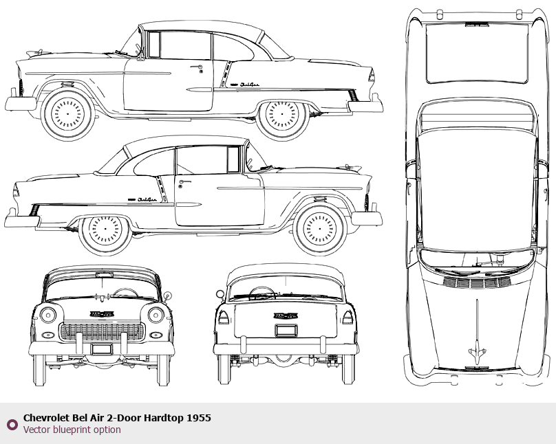 Raster blueprint of the 1955 Chevrolet Bel Air 2-Door Hardtop Tag. This free downloadable image can be used for graphic projects, digital design, and 3D modeling. The file provides accurate exterior proportions of the vehicle. Model year: 1955. Body type: Tag.