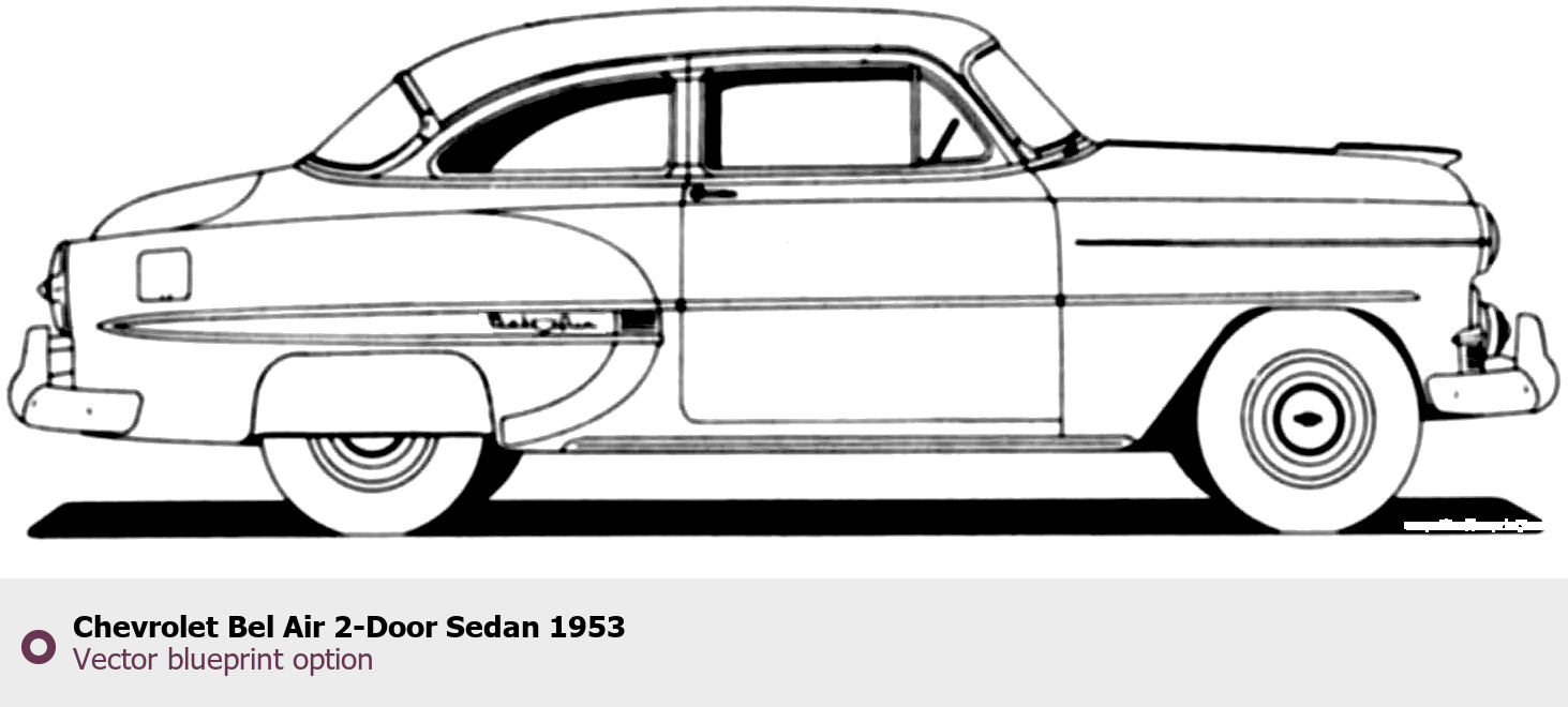 Raster blueprint of the 1953 Chevrolet Bel Air 2-Door Sedan Sedan. This free downloadable image can be used for graphic projects, digital design, and 3D modeling. The file provides accurate exterior proportions of the vehicle. Model year: 1953. Body type: Sedan.