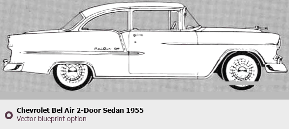 Raster blueprint of the 1955 Chevrolet Bel Air 2-Door Sedan Sedan. This free downloadable image can be used for graphic projects, digital design, and 3D modeling. The file provides accurate exterior proportions of the vehicle. Model year: 1955. Body type: Sedan.