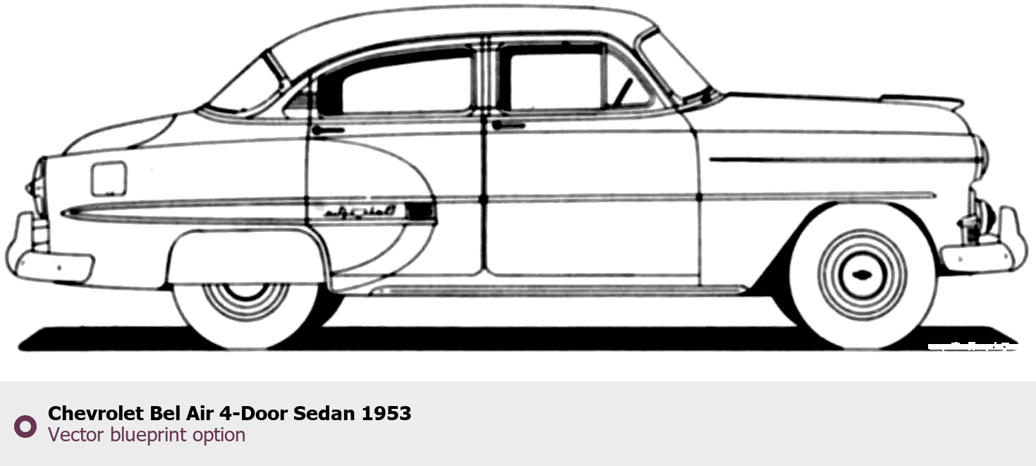 Raster blueprint of the 1953 Chevrolet Bel Air 4-Door Sedan Sedan. This free downloadable image can be used for graphic projects, digital design, and 3D modeling. The file provides accurate exterior proportions of the vehicle. Model year: 1953. Body type: Sedan.