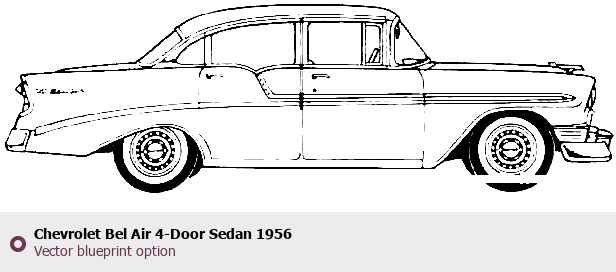 Raster blueprint of the 1956 Chevrolet Bel Air 4-Door Sedan Sedan. This free downloadable image can be used for graphic projects, digital design, and 3D modeling. The file provides accurate exterior proportions of the vehicle. Model year: 1956. Body type: Sedan.