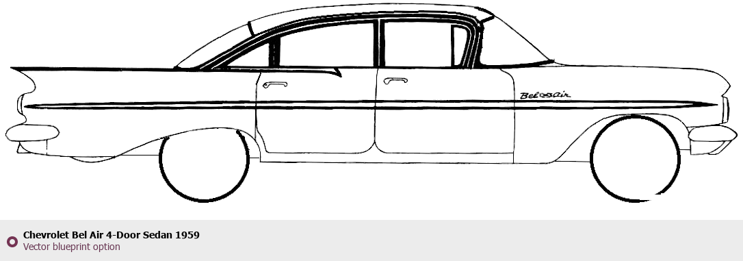 Raster blueprint of the 1959 Chevrolet Bel Air 4-Door Sedan Sedan. This free downloadable image can be used for graphic projects, digital design, and 3D modeling. The file provides accurate exterior proportions of the vehicle. Model year: 1959. Body type: Sedan.