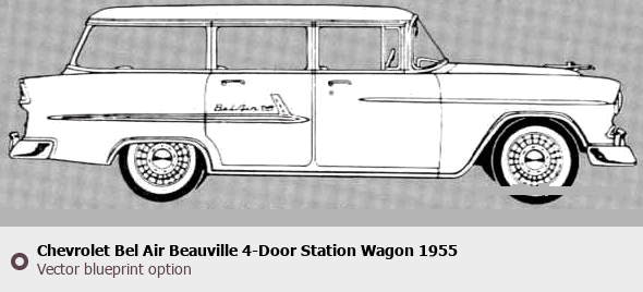 Raster blueprint of the 1955 Chevrolet Bel Air Beauville 4-Door Station Wagon Wagon. This free downloadable image can be used for graphic projects, digital design, and 3D modeling. The file provides accurate exterior proportions of the vehicle. Model year: 1955. Body type: Wagon.