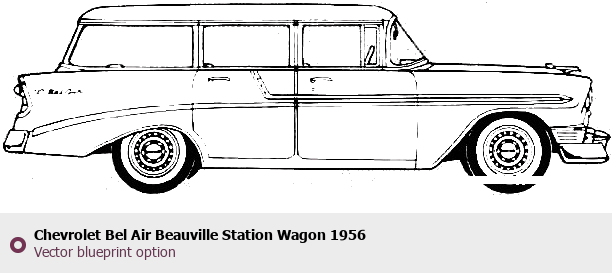 Raster blueprint of the 1956 Chevrolet Bel Air Beauville Station Wagon Wagon. This free downloadable image can be used for graphic projects, digital design, and 3D modeling. The file provides accurate exterior proportions of the vehicle. Model year: 1956. Body type: Wagon.