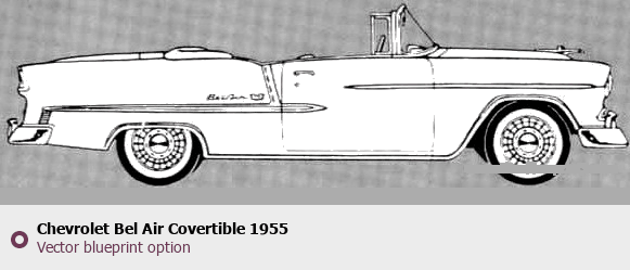 Raster blueprint of the 1955 Chevrolet Bel Air Covertible Tag. This free downloadable image can be used for graphic projects, digital design, and 3D modeling. The file provides accurate exterior proportions of the vehicle. Model year: 1955. Body type: Tag.