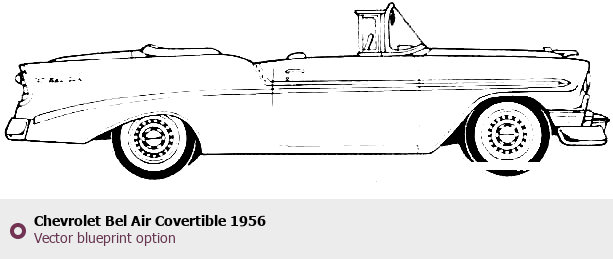 Raster blueprint of the 1956 Chevrolet Bel Air Covertible Tag. This free downloadable image can be used for graphic projects, digital design, and 3D modeling. The file provides accurate exterior proportions of the vehicle. Model year: 1956. Body type: Tag.