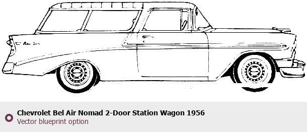 Raster blueprint of the 1956 Chevrolet Bel Air Nomad 2-Door Station Wagon Wagon. This free downloadable image can be used for graphic projects, digital design, and 3D modeling. The file provides accurate exterior proportions of the vehicle. Model year: 1956. Body type: Wagon.