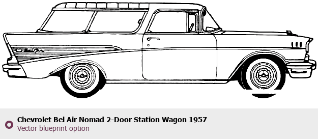 Raster blueprint of the 1957 Chevrolet Bel Air Nomad 2-Door Station Wagon Wagon. This free downloadable image can be used for graphic projects, digital design, and 3D modeling. The file provides accurate exterior proportions of the vehicle. Model year: 1957. Body type: Wagon.