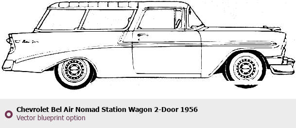 Raster blueprint of the 1956 Chevrolet Bel Air Nomad Station Wagon 2-Door Wagon. This free downloadable image can be used for graphic projects, digital design, and 3D modeling. The file provides accurate exterior proportions of the vehicle. Model year: 1956. Body type: Wagon.