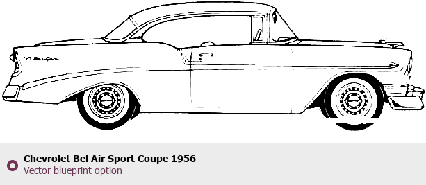 Raster blueprint of the 1956 Chevrolet Bel Air Sport Coupe Coupe. This free downloadable image can be used for graphic projects, digital design, and 3D modeling. The file provides accurate exterior proportions of the vehicle. Model year: 1956. Body type: Coupe.