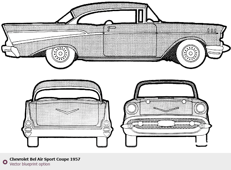 Raster blueprint of the 1957 Chevrolet Bel Air Sport Coupe Coupe. This free downloadable image can be used for graphic projects, digital design, and 3D modeling. The file provides accurate exterior proportions of the vehicle. Model year: 1957. Body type: Coupe.